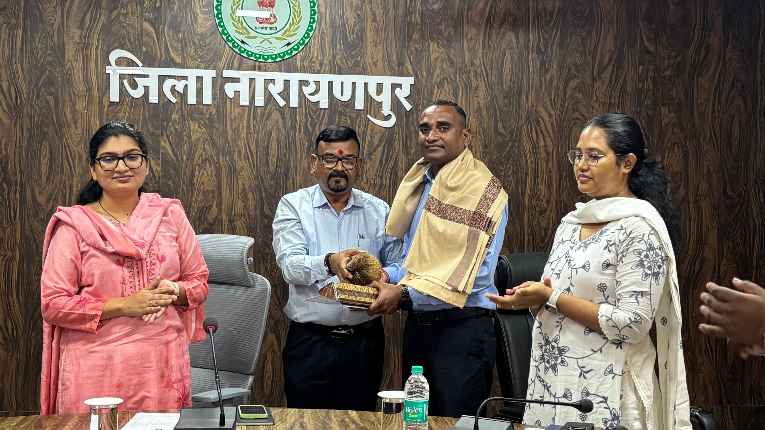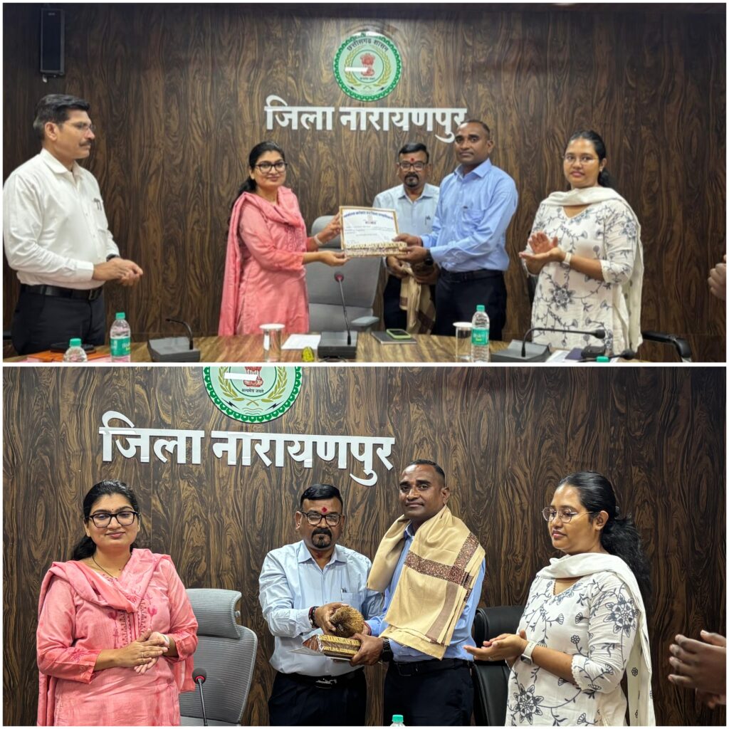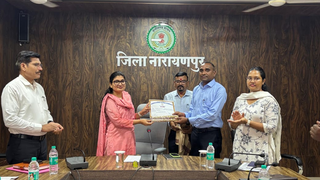 जिला नारायणपुर में आयोजित साप्ताहिक बैठक के दौरान कलेक्टर नम्रता जैन द्वारा शॉल एवं श्रीफल भेंट कर सम्मान किया गया।