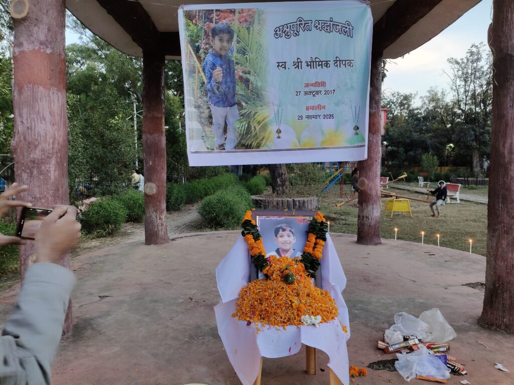 8-12-2025 को ज़ब अंबेडकर पार्क में शाम के समय स्व श्री.. भौमिक दीपक का श्रद्धांजलि अर्पित माता-पिता के द्वारा रखा गया जिसमें साहू समाज के एवं हर वर्ग के लोग मौजूद थे शिक्षा विभाग के उच्च अधिकारी गण भी मौजूद थे मोमबत्ती जलाकर स्व.. श्री भौमिक दीपक को अंतिम श्रद्धांजलि अर्पित किया गया